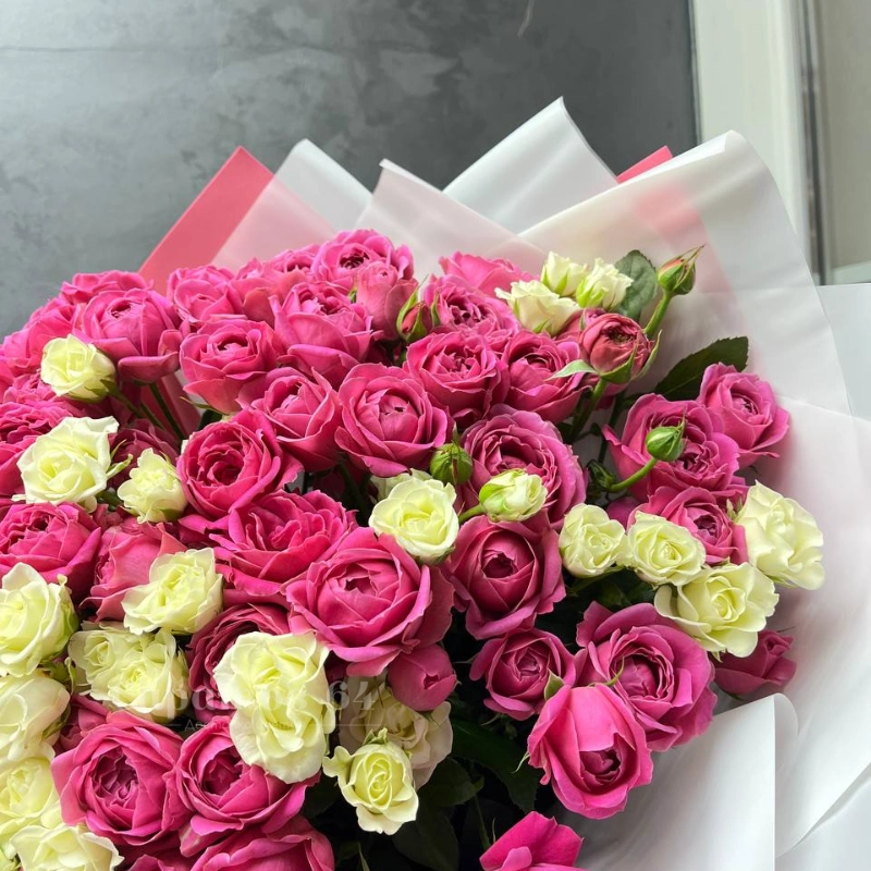 Букет представляет собой великолепное сочетание розовых и белых роз, создавая нежный и элегантный образ. Небольшие, пышные бутоны плотно собраны вместе, наполняя композицию яркими красками и ароматом свежих цветов. Этот букет станет прекрасным подарком для любого торжества, выражая нежность и любовь.