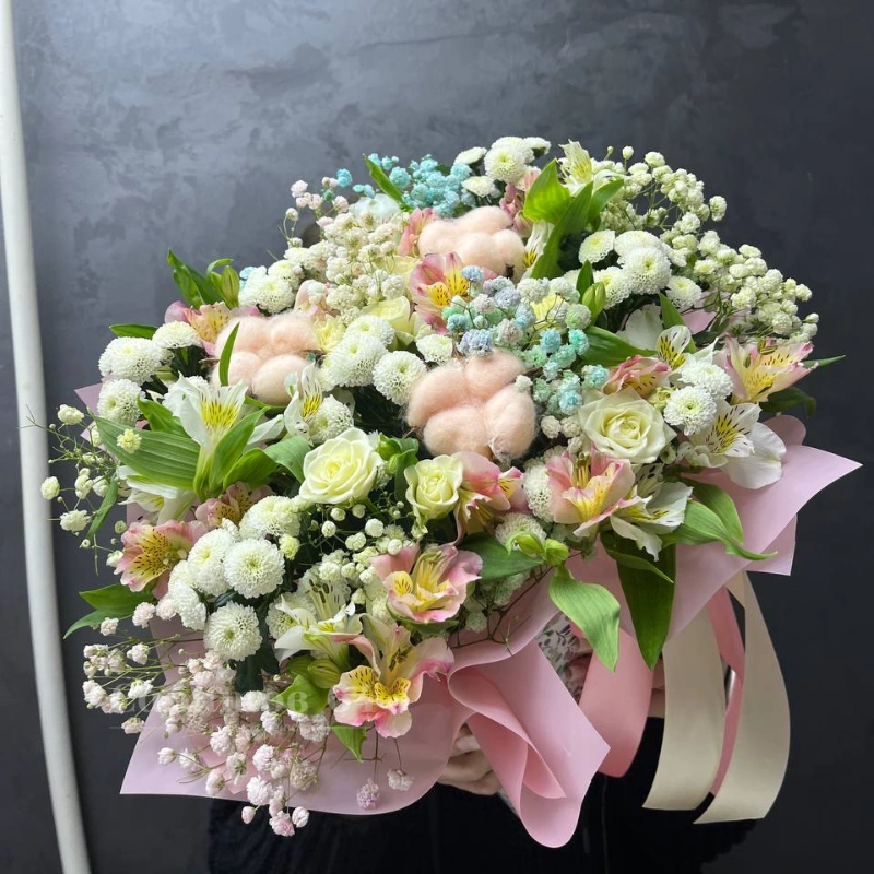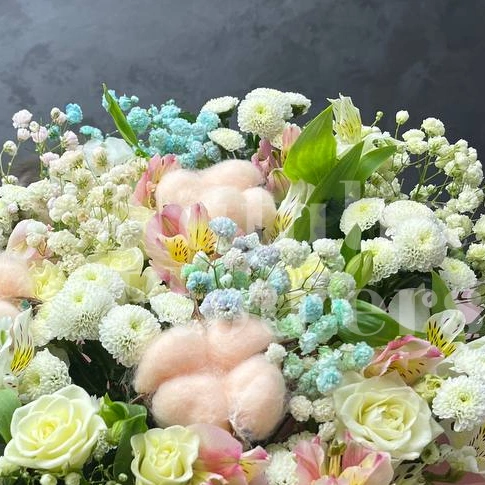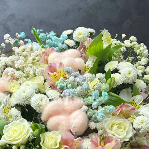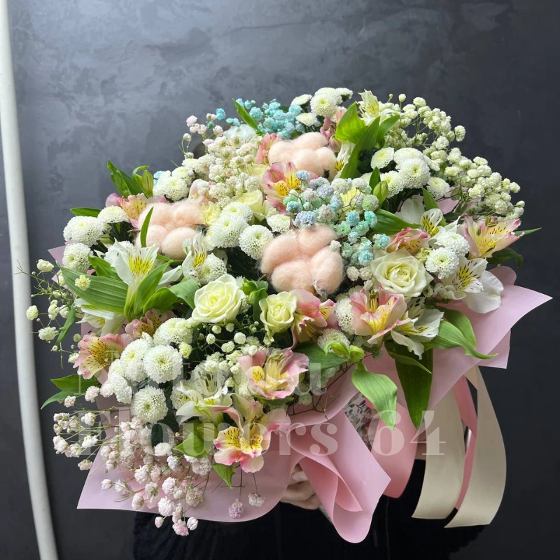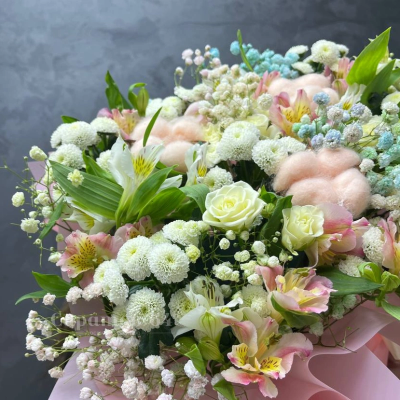 Нежный букет в пастельных тонах, состоящий из белых роз, альстромерий и хризантем, дополненный пушистыми розовыми декоративными элементами и гипсофилой. Этот букет станет прекрасным подарком для близкого человека, наполняя его нежностью и уютом. Букет излучает тепло и лёгкость, создавая атмосферу романтики и заботы.