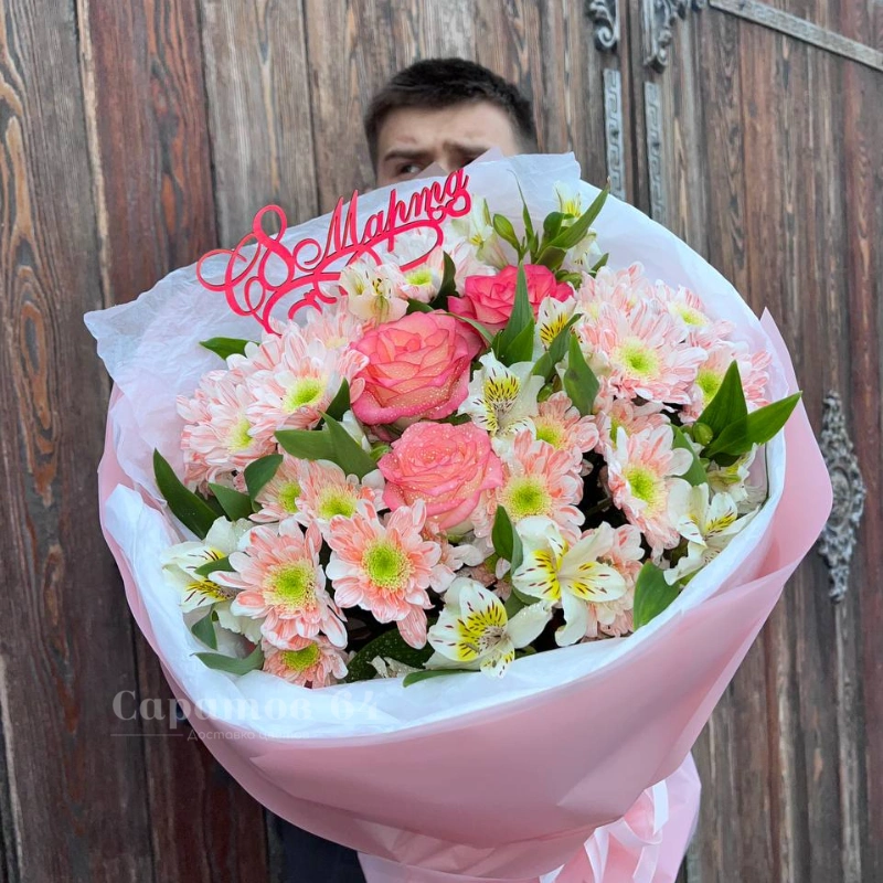 Букет с розами, хризантемами и альстромерией