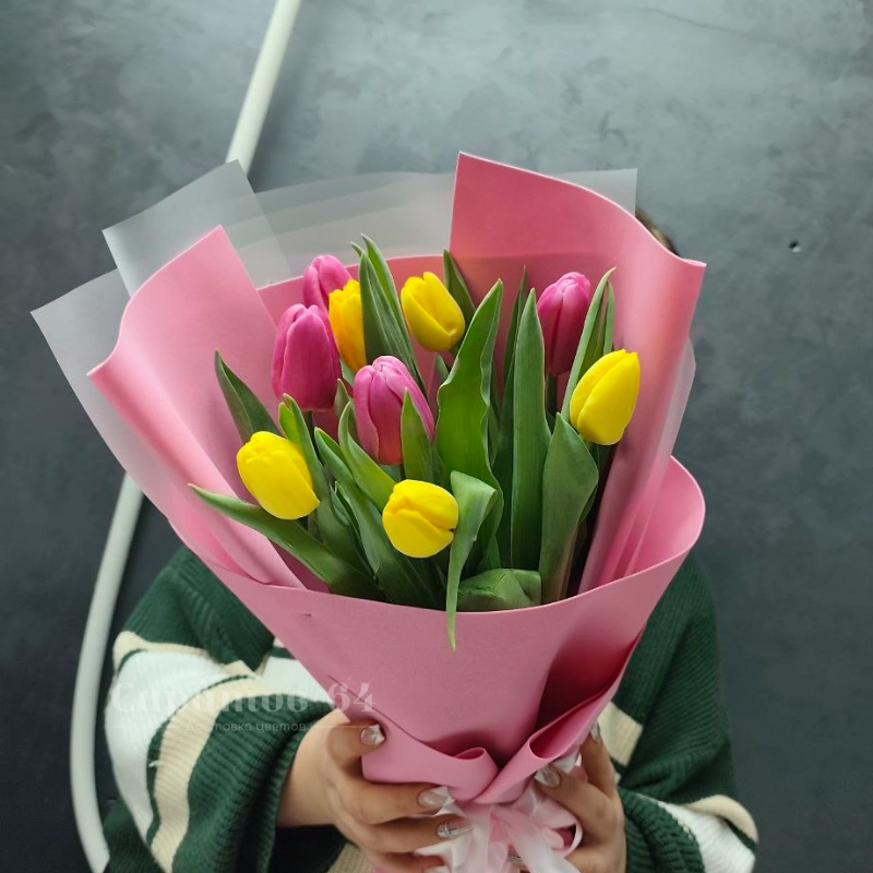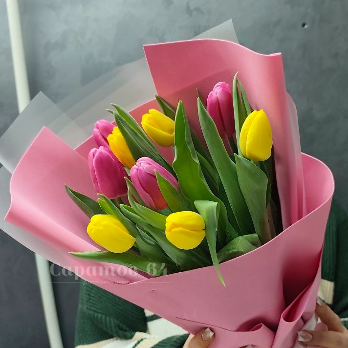 ГлавнаяКаталогБукеты9 тюльпанов микс в розовой упаковке