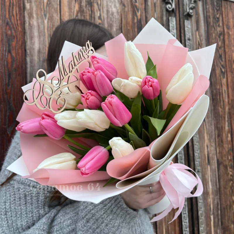 Букет 17 тюльпанов микс в оформлении