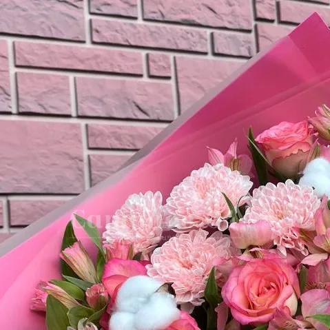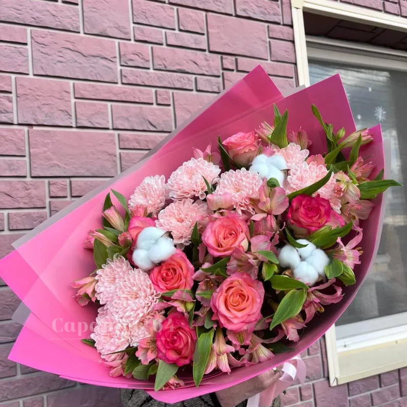 Круглый букет розовый микс с альстромерией, розами и хризантемой