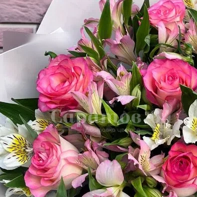 Букет 7 роз с альстромериями
