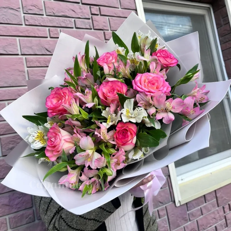 Круглый букет розовый микс с альстромерией, розами и хризантемой