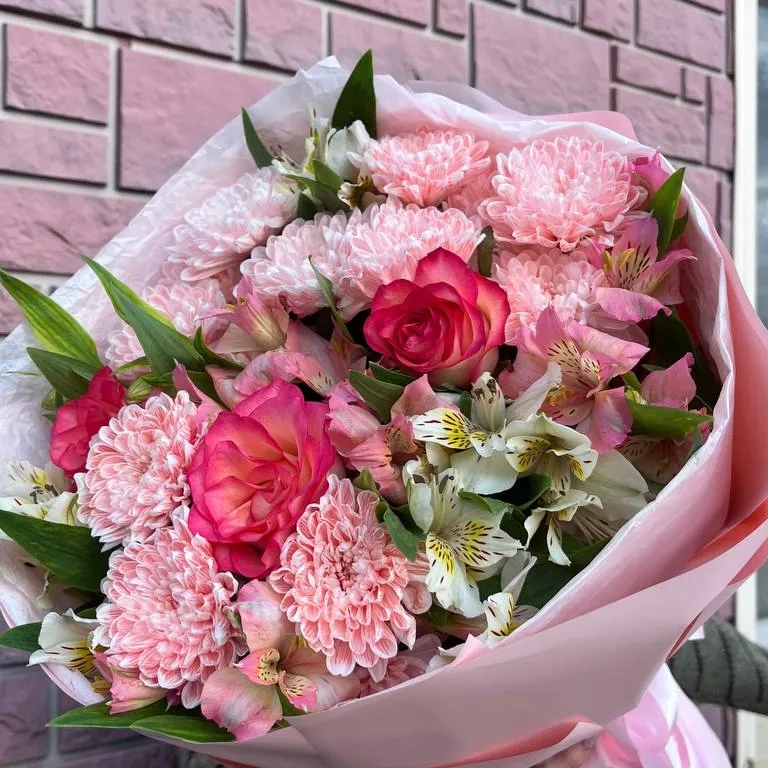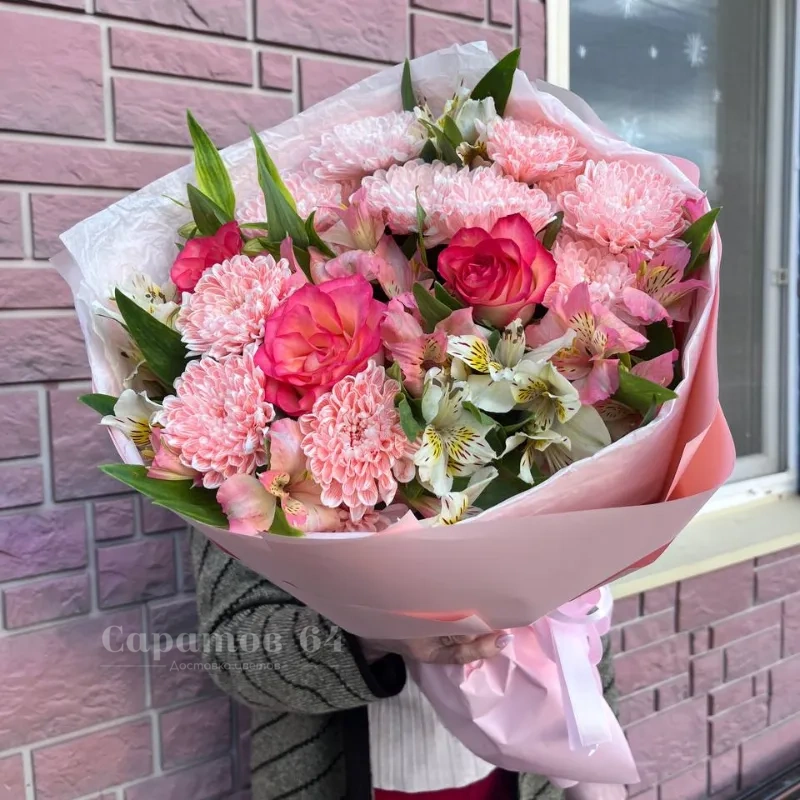 Круглый букет розовый микс с альстромерией, розами и хризантемой