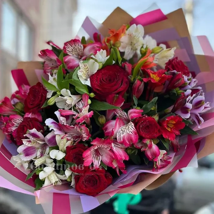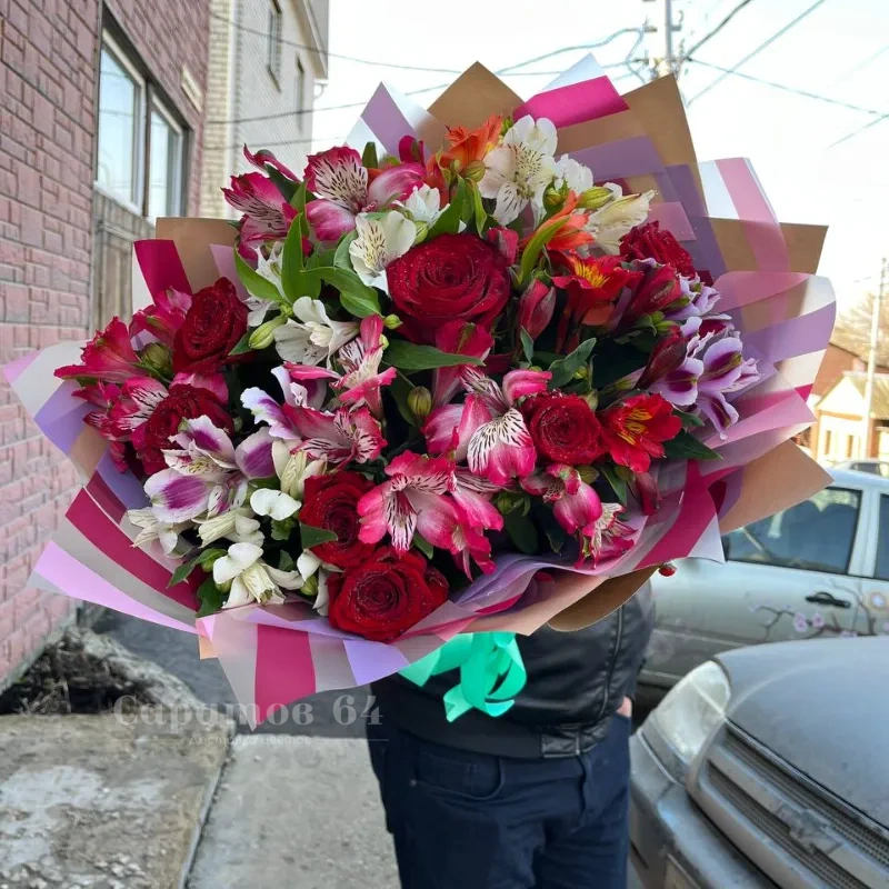 ГлавнаяКаталогБукетыЯркий букет из красных роз и альстромерии микс