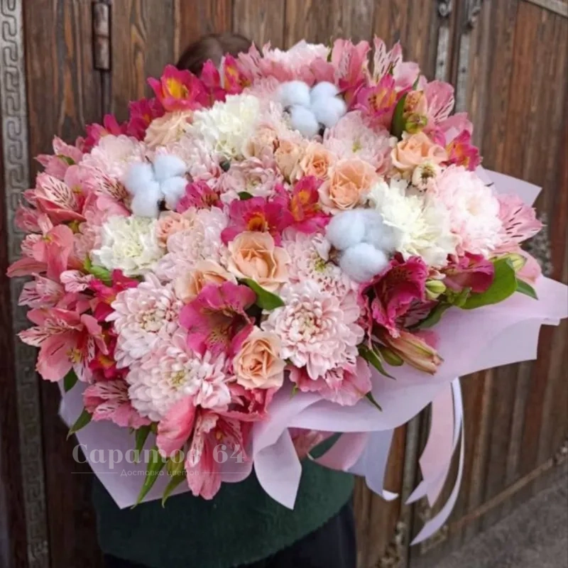 Круглый букет розовый микс с альстромерией, розами и хризантемой