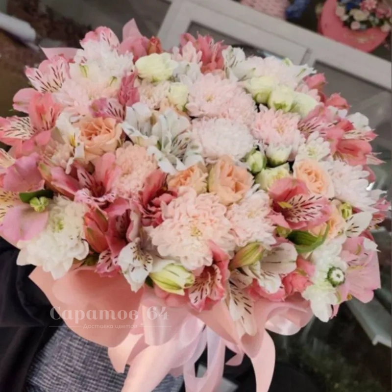 Букет с розами и альстромерией «яблочко»