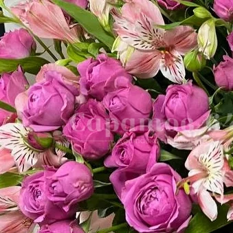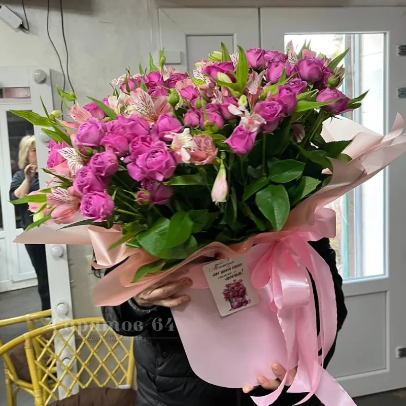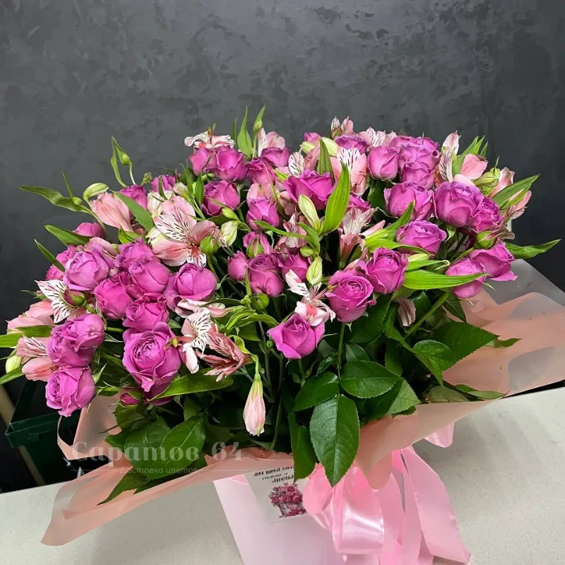 Цветы в коробке-трапеции  микс с малиновыми альстромериями